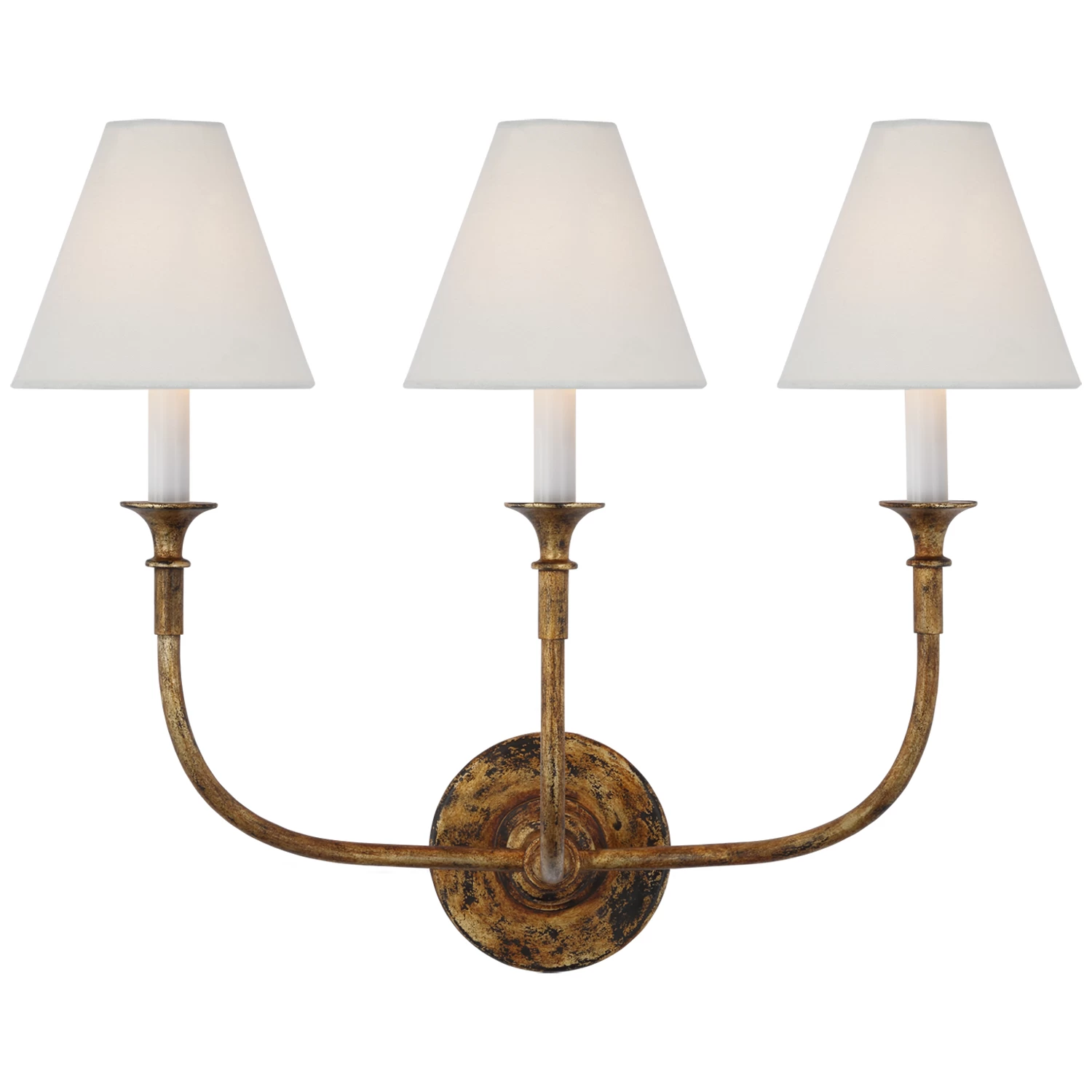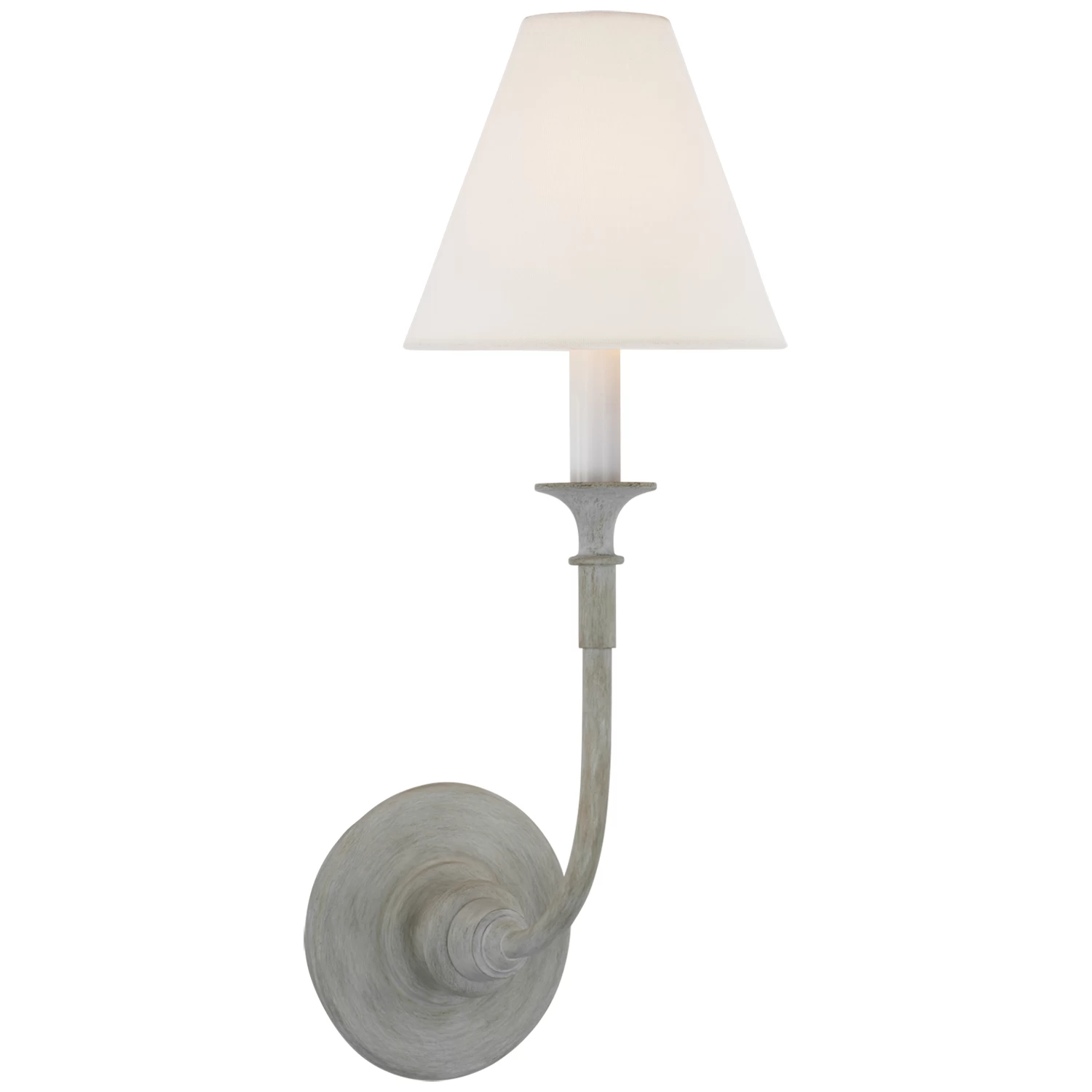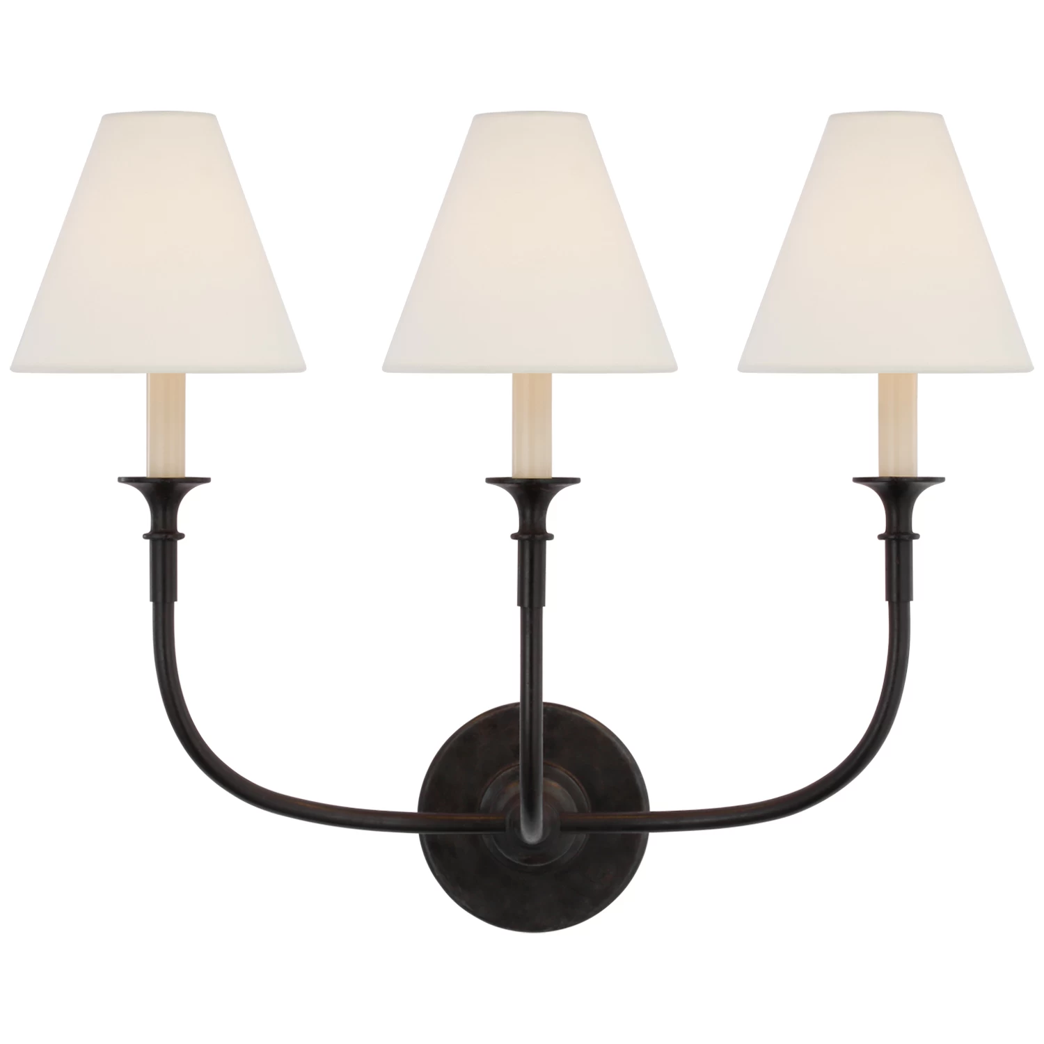 The Piaf Wall Sconce brings a clean, airy feel to your interior space. The steel frame is accented with decorative hubs and topped with conical linen shades that cast warm shadows across your room.