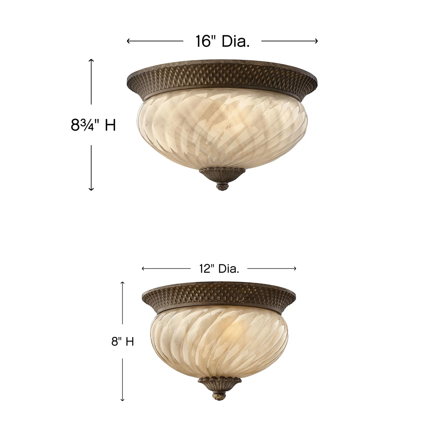 The Pineapple Outdoor Ceiling Light Fixture features a Pearl Bronze finish with Etched Amber Optic glass or a Museum Black finish with Clear Optic glass. Two sizes available. UL listed for damp locations.