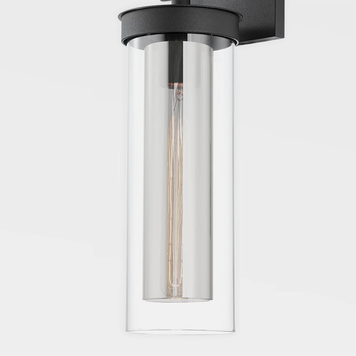 The Pira Wall Sconce is both upscale and usable. A cylinder of clear glass is layered over a similarly shaped shade of smoked glass with textured black finish or champagne glass with patina brass finish, creating an edgy, unique look. The machined-metal details of the square backplate and rectangular arm take this sophisticated sconce to the next level.