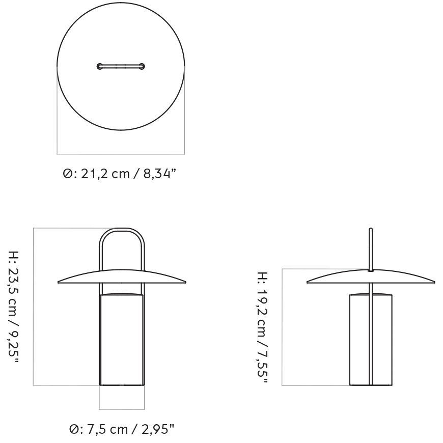 The distinctive silhouette of the Ray Portable Table Lamp was inspired by antique mining lanterns. A convenient handle atop the shade allows the lamp to be easily carried and placed wherever additional lighting is needed. The dimmer switch located on the base allows the LED lamp to be set to 25, 50, or 100 percent brightness. Rechargeable battery life ranges from 11 to 30 hours depending on brightness setting. Approximately 8 hour charging time.