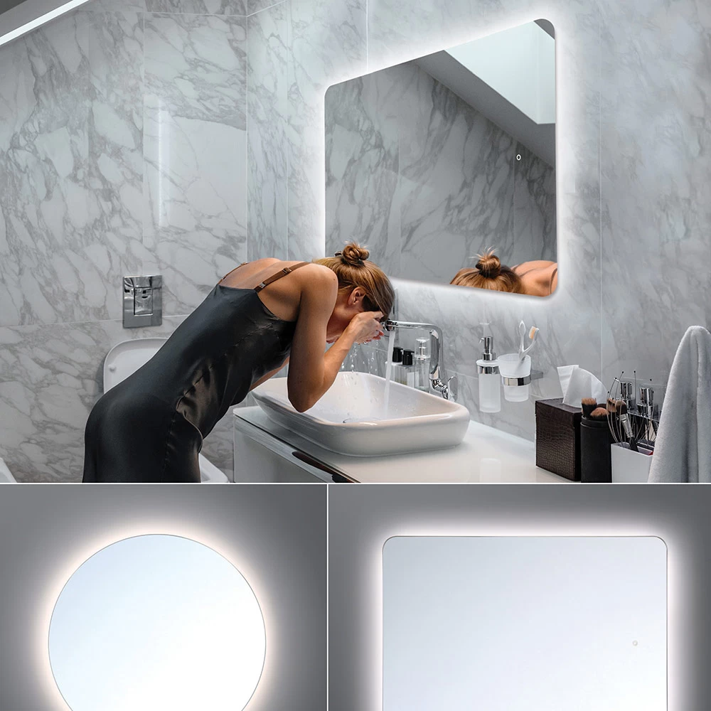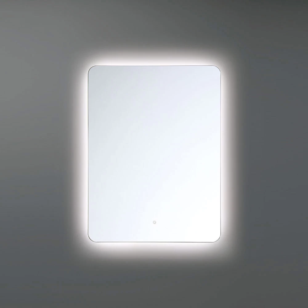 The Rectangle Mirror with Back light features a seamless design with a round mirror that sits away from the wall and gives off light from behind the glass. ETL listed, damp locations. Title 24 compliant.