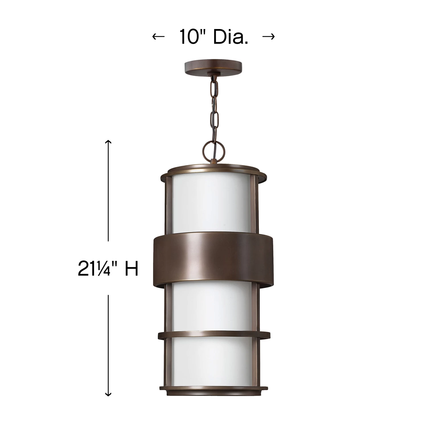 The Saturn 120V Outdoor Pendant features an Etched Opal glass diffuser with a Metro Bronze or Stainless Steel finish.