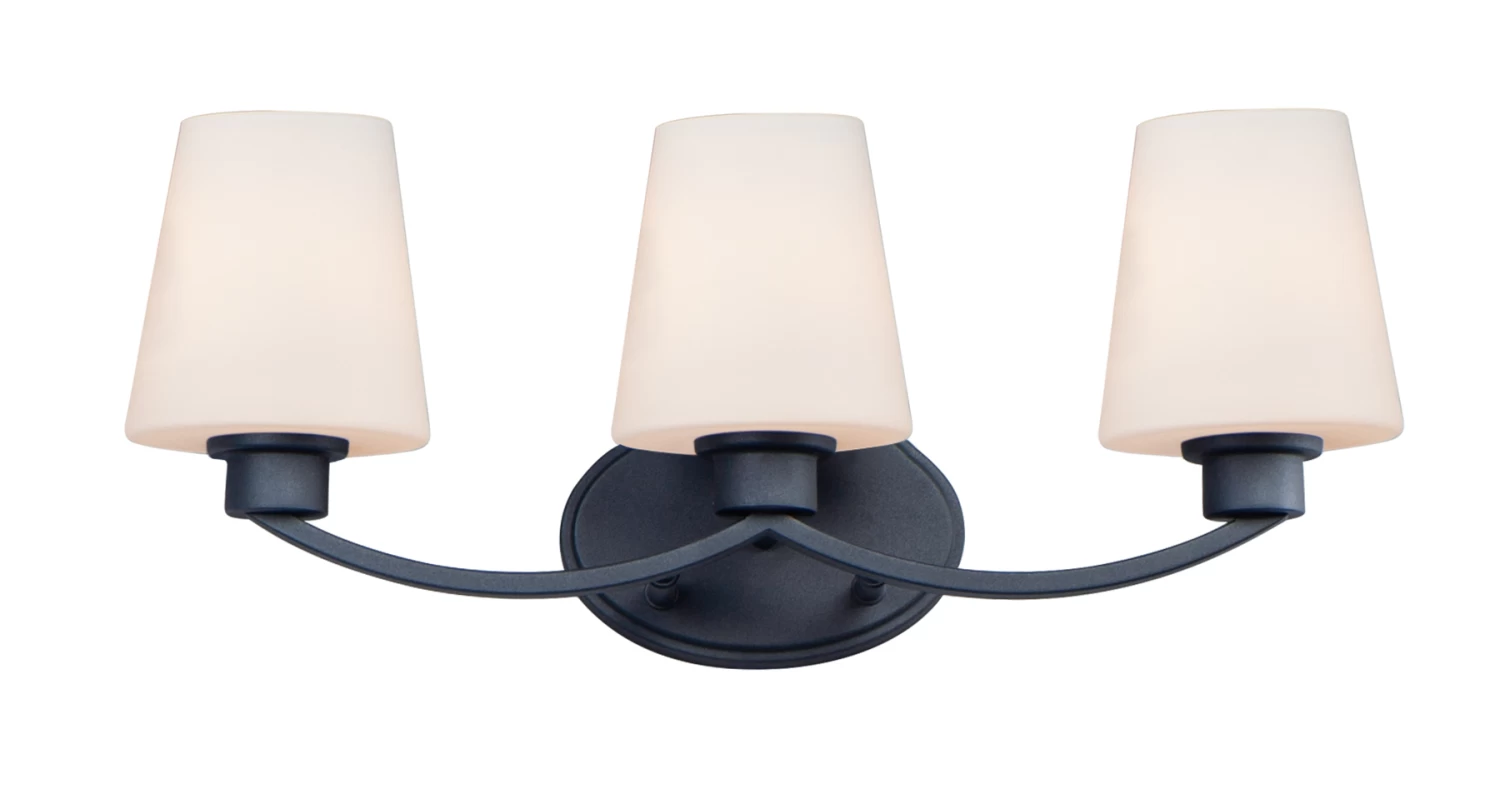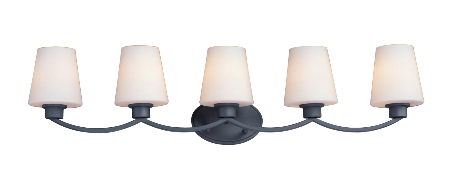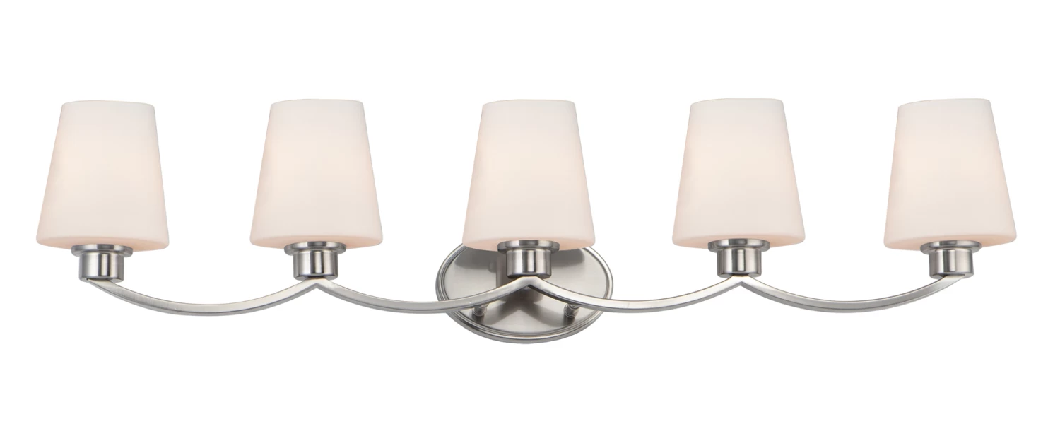 The Shelter Wall Sconce’s clean and crisp design is suitable for any transitional decor. Rectangular tubing, finished in either Satin Nickel or Black, gracefully arcs to round cups that support tapered Satin White Glass shades. Place the Shelter in the bathroom for a modern refresh. Available in 2, 3, or 5 light configurations. Damp location rated. UL listed.