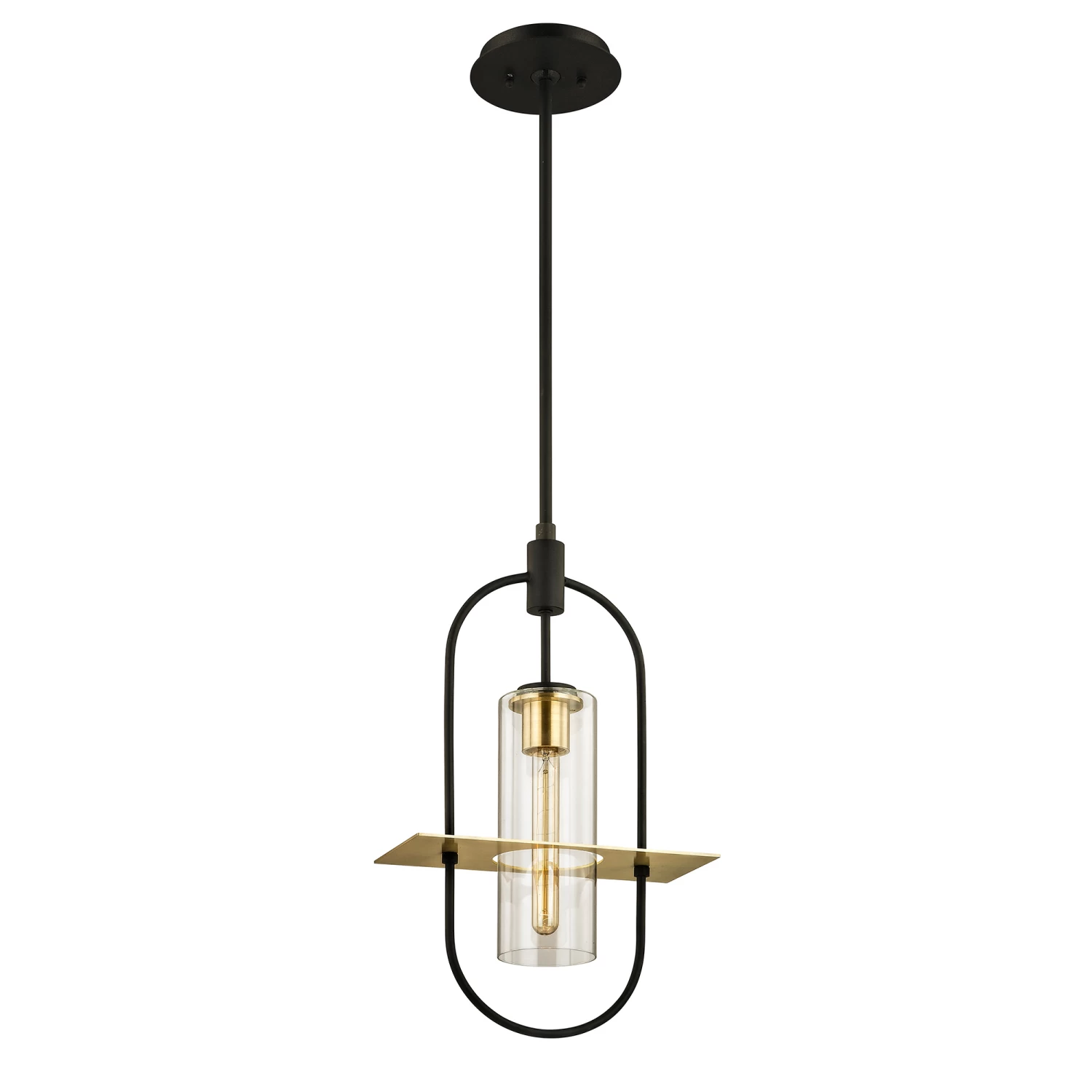 Smyth Outdoor Pendant has a unique look that will go perfect with any exterior style. The Dark Bronze frame hold a Clear glass cylinder that is accented by a Warm Brass plate and lamp holder. Comes with one 6 inch, two 12 inch, and one 18 inch rods to customize length. Damp location rated. UL listed.