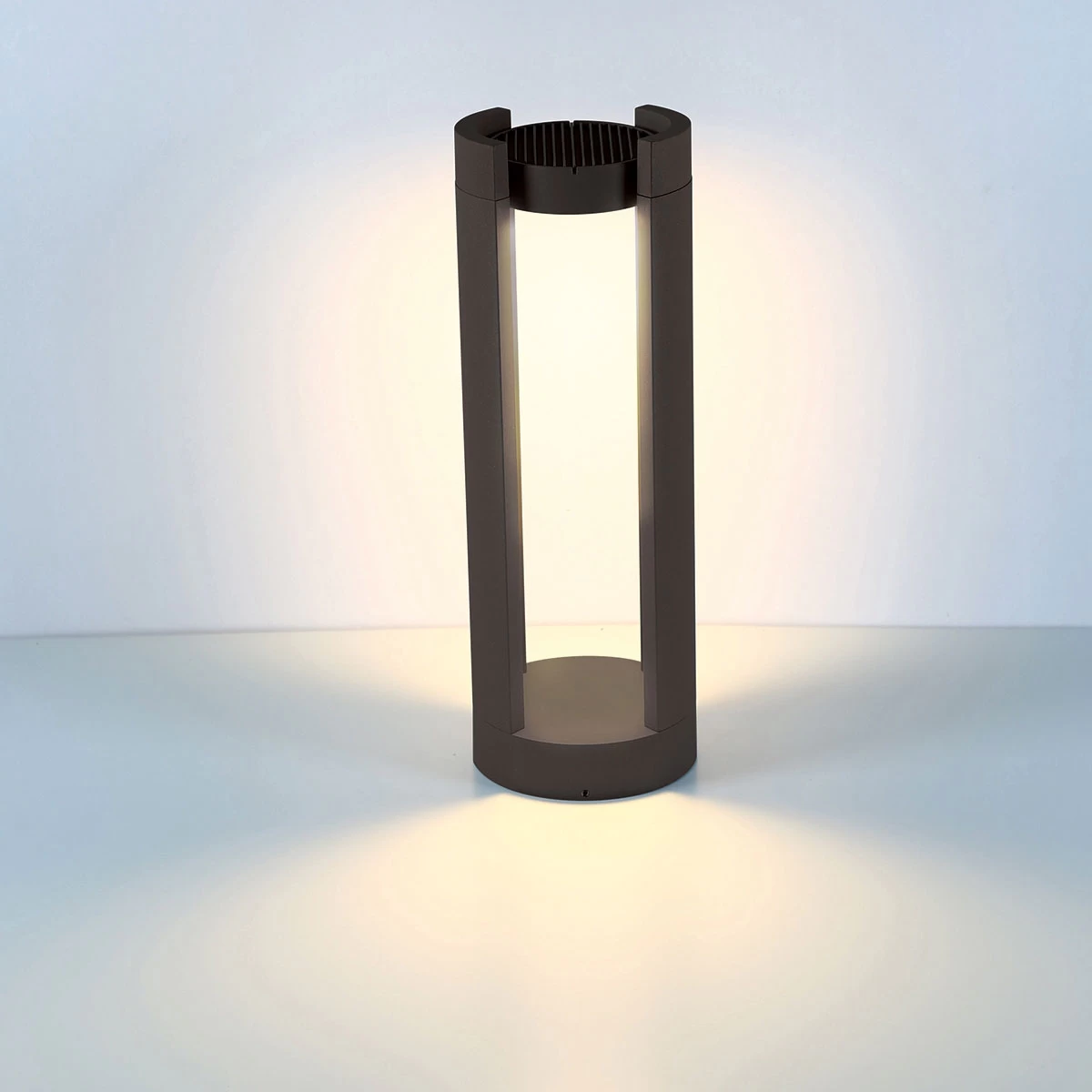 The 31922 / 31923 Outdoor Bollard features a cylindrical form finished in Graphite Grey, with an open center and an adjustable spotlight-like light source that can be adjusted to have light positioned where you need it. Available in two sizes. This fixture comes with hardward allowing it to be mounted to concrete. ETL listed for wet locations.
