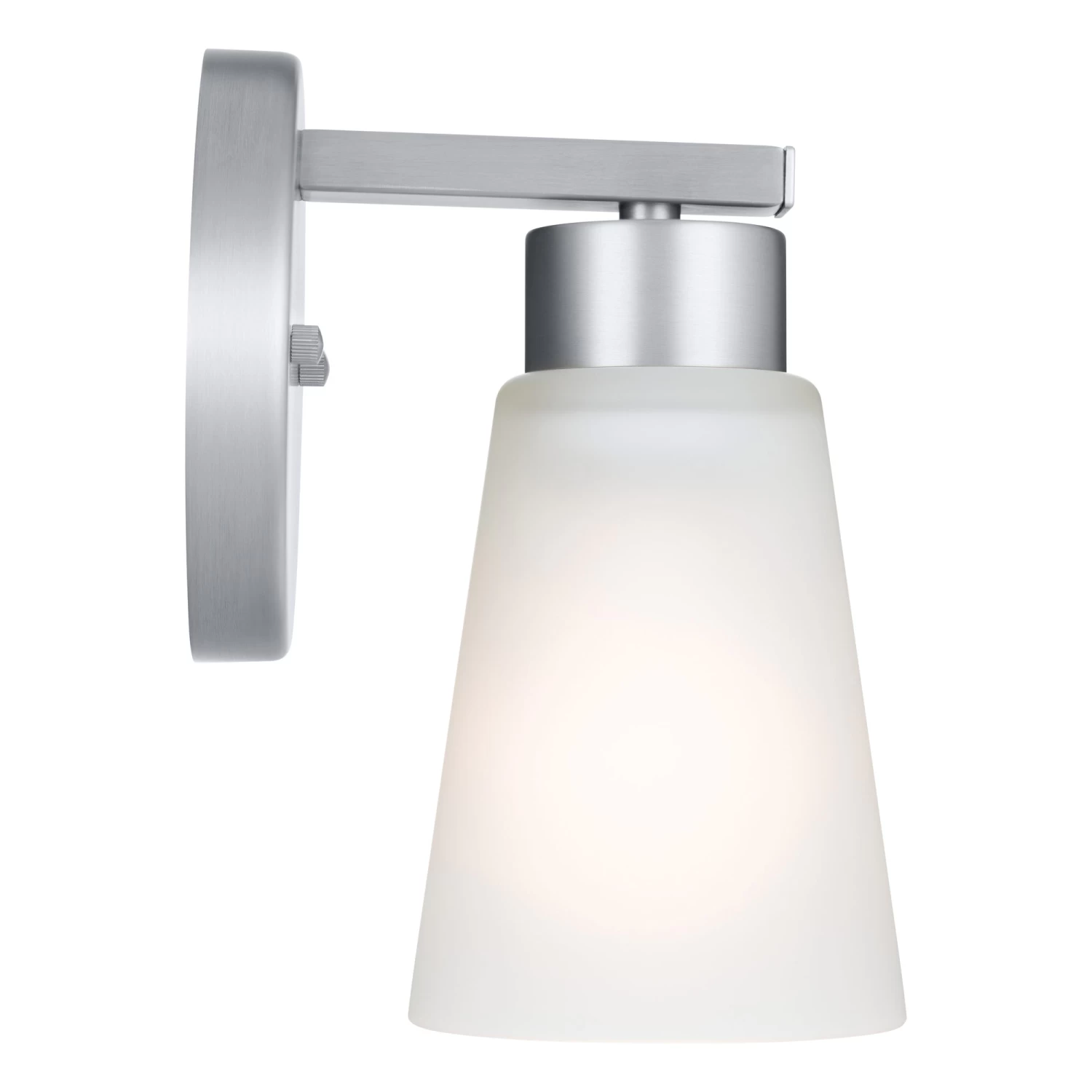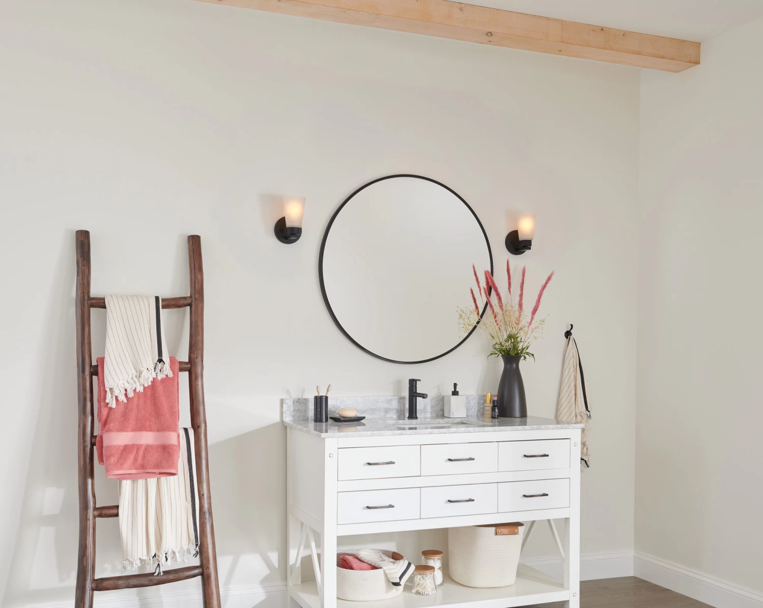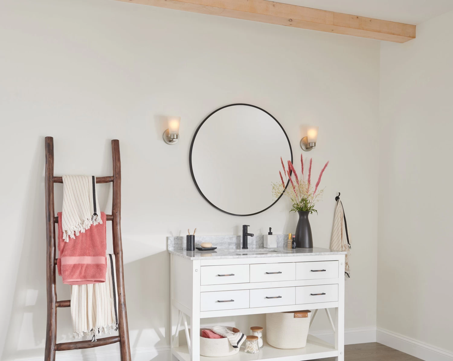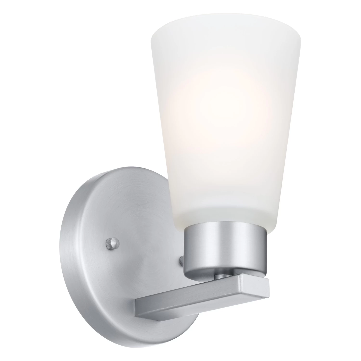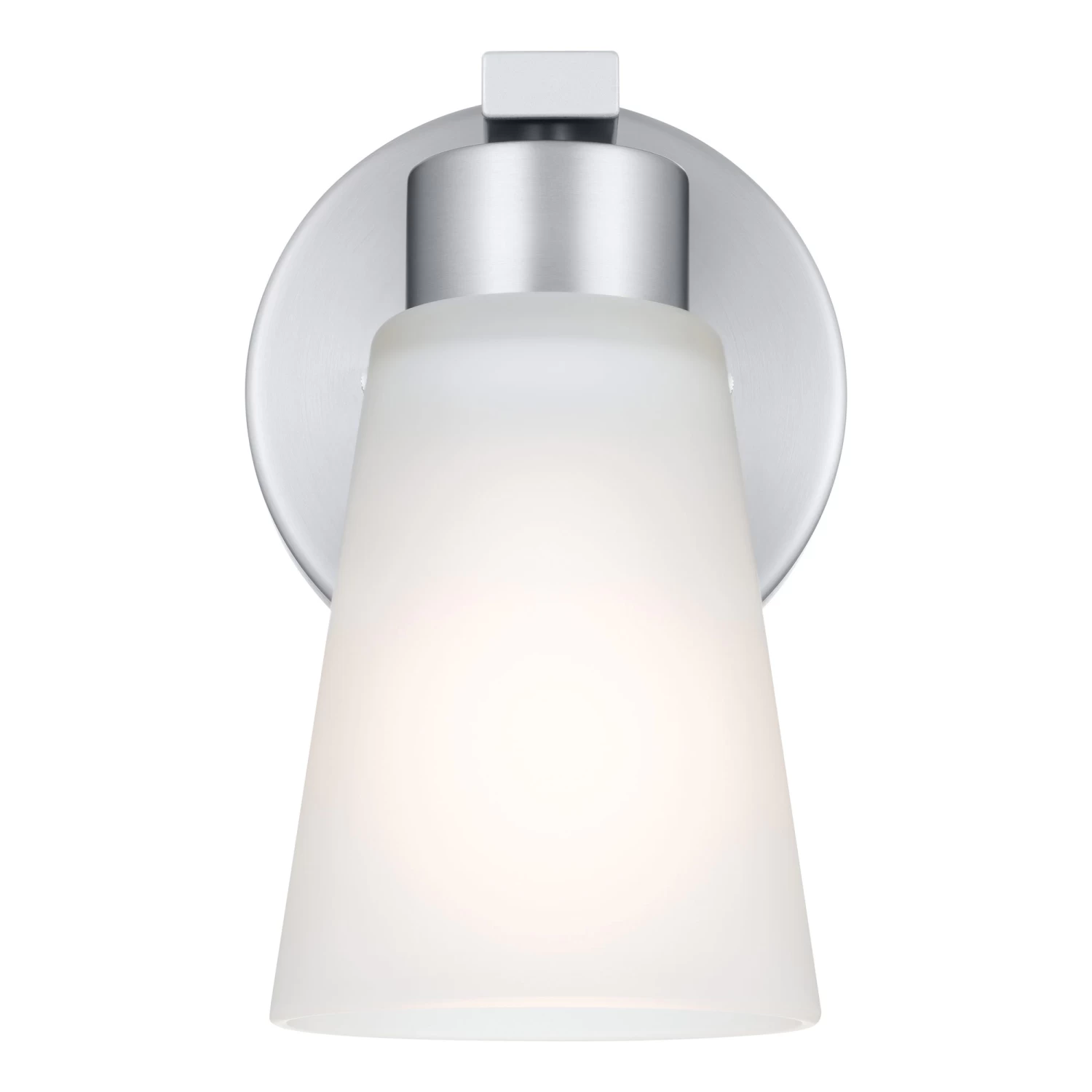 The Stamos Wall Sconce offers a versatile, casual aesthetic with its simple steel frame paired with a satin etched glass shade. Blending well with many interior styles, it is perfect for illuminating a dining room, hallway, or bathroom. It can be installed facing up or down.