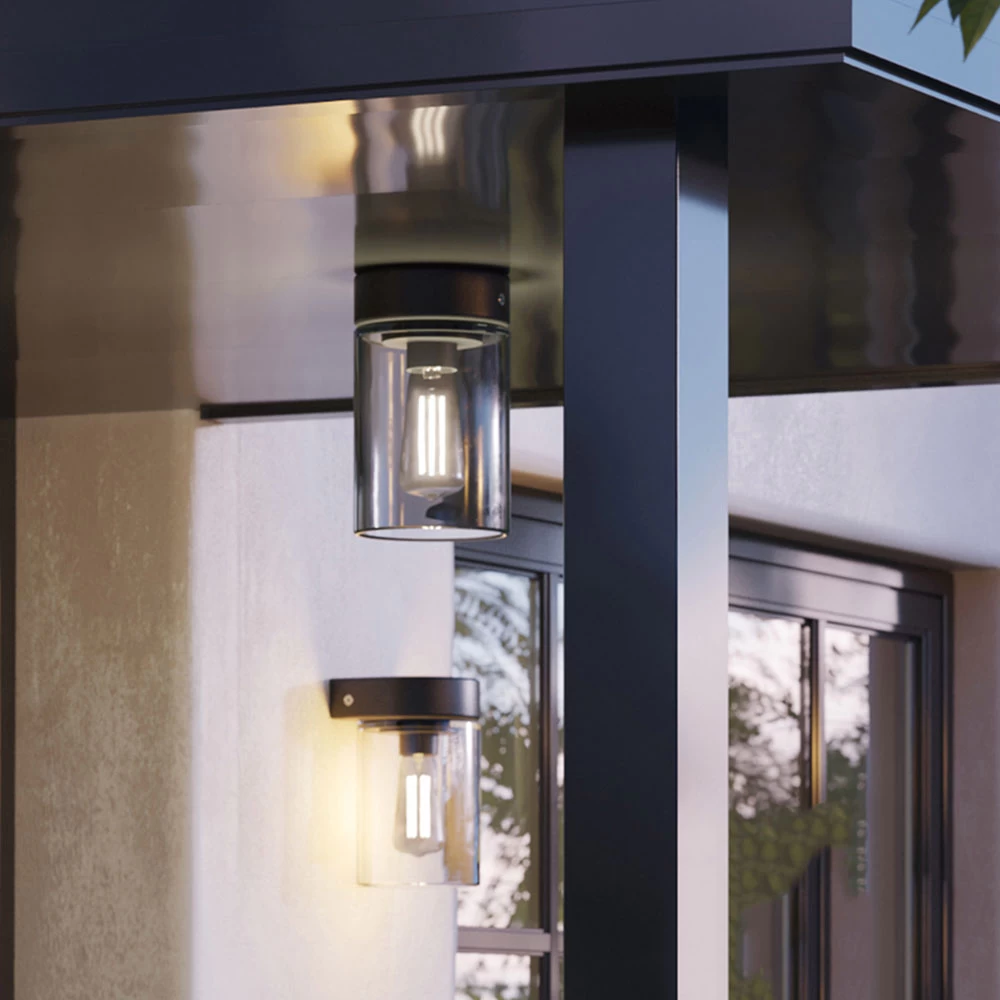 The Tesla Outdoor Ceiling Light features a powder coat aluminum finish with a handmade glass shade. Includes a decorative LED filament lamp. IP43 rated for wet locations.