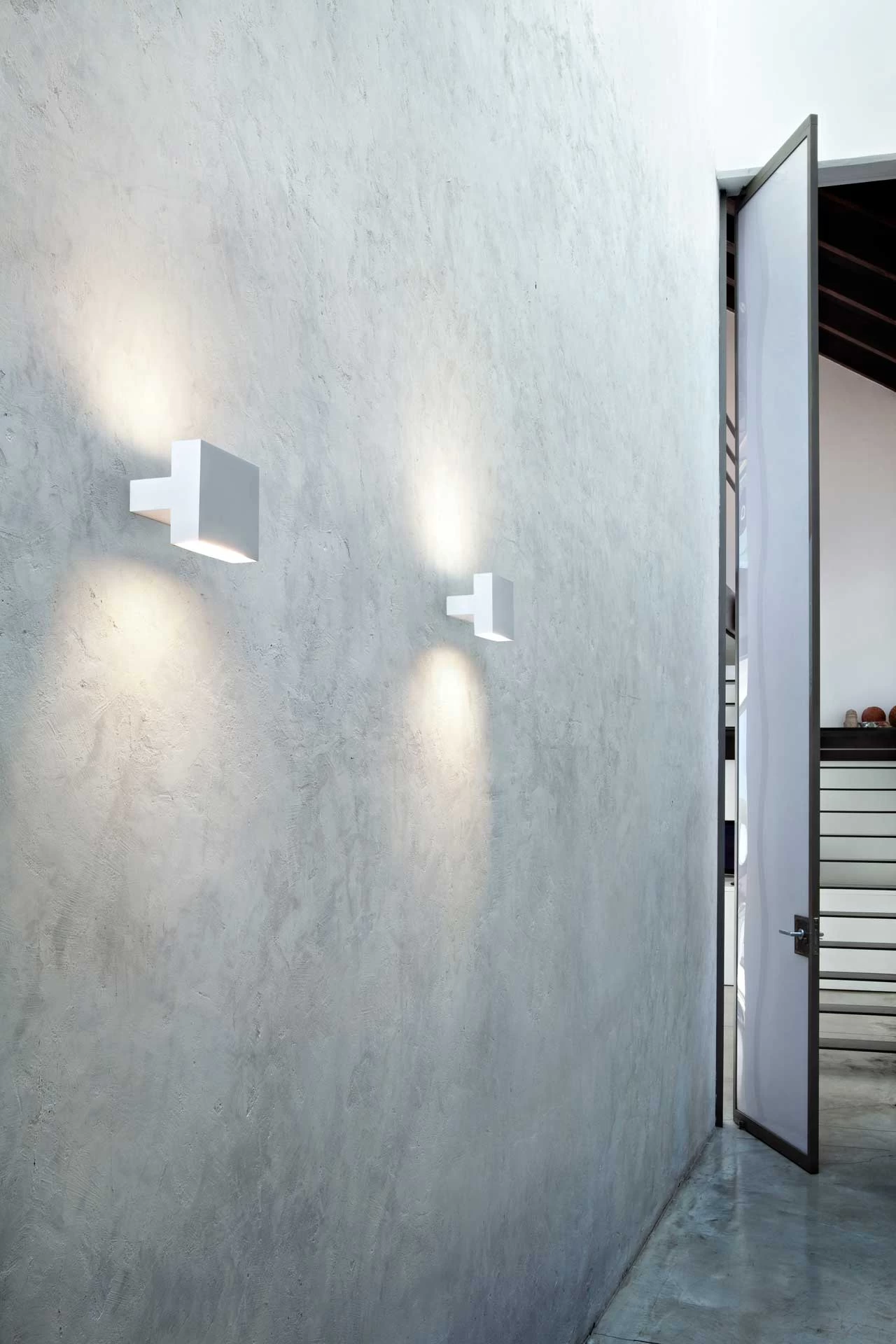 Direct-indirect light wall lamp with body in painted White extruded aluminium. Diffusers in injection printed PMMA with photo-engraved finish. Multi-voltage power pack integrated in the body as well and can only be mounted on j-boxes using a universal mounting ring, not included. Integrated 18 watt 120 volt LED light souce. 6.29 inch width x 5.11 inch height x 3.93 inch depth. For indoor use only. UL listed. ADA Compliant. Non-dimmable.