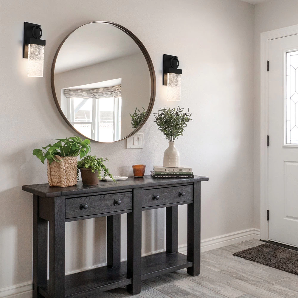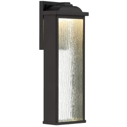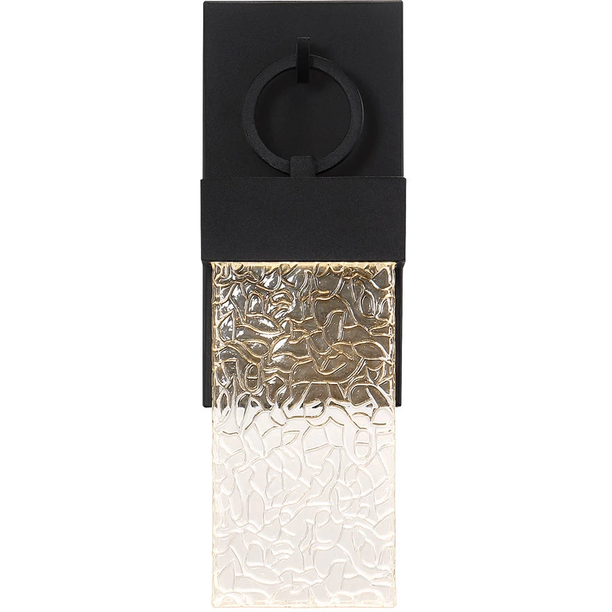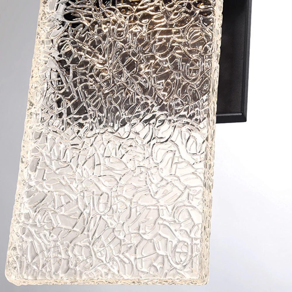 The Vasso Outdoor Wall Sconce features a glass panel with a shatter pattern of creases and grooves. LED light shines through the glass, highlighting the texture and providing ambient illumination for outoor or indoor spaces. Dimmable with a TRIAC dimmer.
