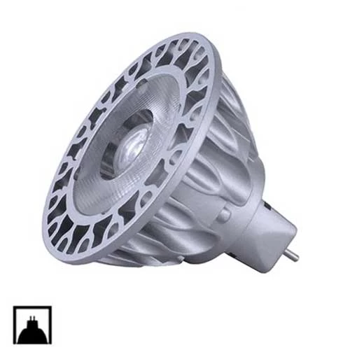 Vivid 3 7.5 Watt 12 volt LED GU5.3 base MR16 from Soraa with 10, 25 or 36 degree beam angle in Very Warm White 2700K, Warm White 3000K, or Neutral White 4000K, 95CRI. Lumen output range of 390 to 455 lumens. Equivalent to a 50 watt halogen. 35,000 hour average lamp life. Saves over 85 percent of energy compared to standard halogen lamps. LED retrofit lamp to replace 12 volt MR16 GU5.3 base halogen lamps in recessed downlights, track lighting, and other indoor and outdoor applications. Dimmable to less than 20 percent with trailing edge and leading edge phase cut dimmers, 12 volt AC magnetic and electronic transformers and 12 volt DC transformers (see attached manufacturer specification for dimmer and transformer compatibility). UL listed. Suitable for fully enclosed fixtures (subject to manufacturer maximum heatsink temperature limits) and damp locations. 3 year warranty or 25,000 hours (whichever comes first). 10 Degree beam angle version SNAP accessory compatible, sold separately.