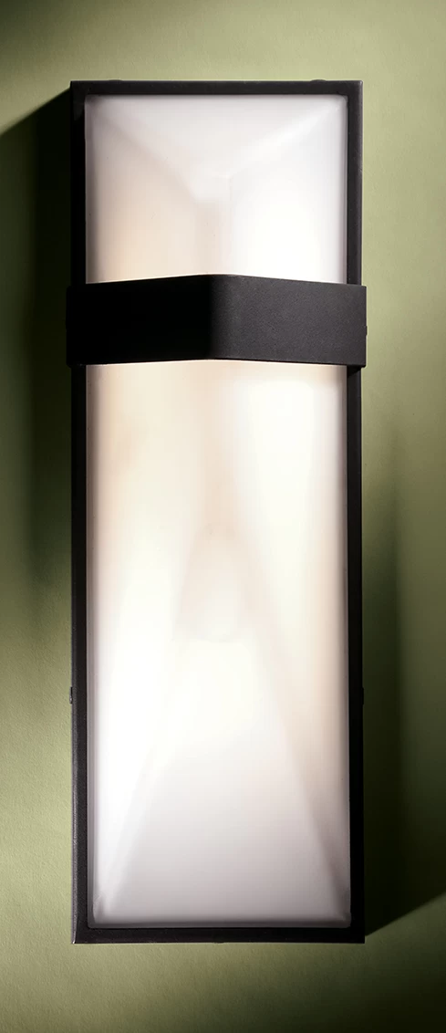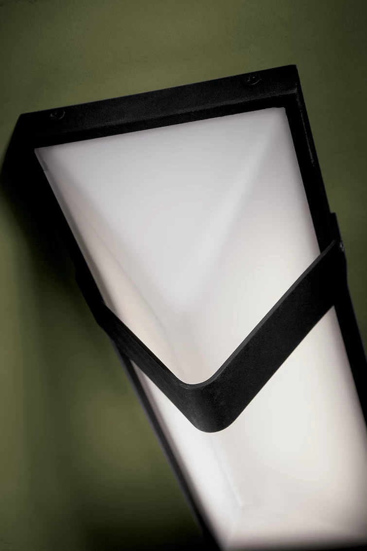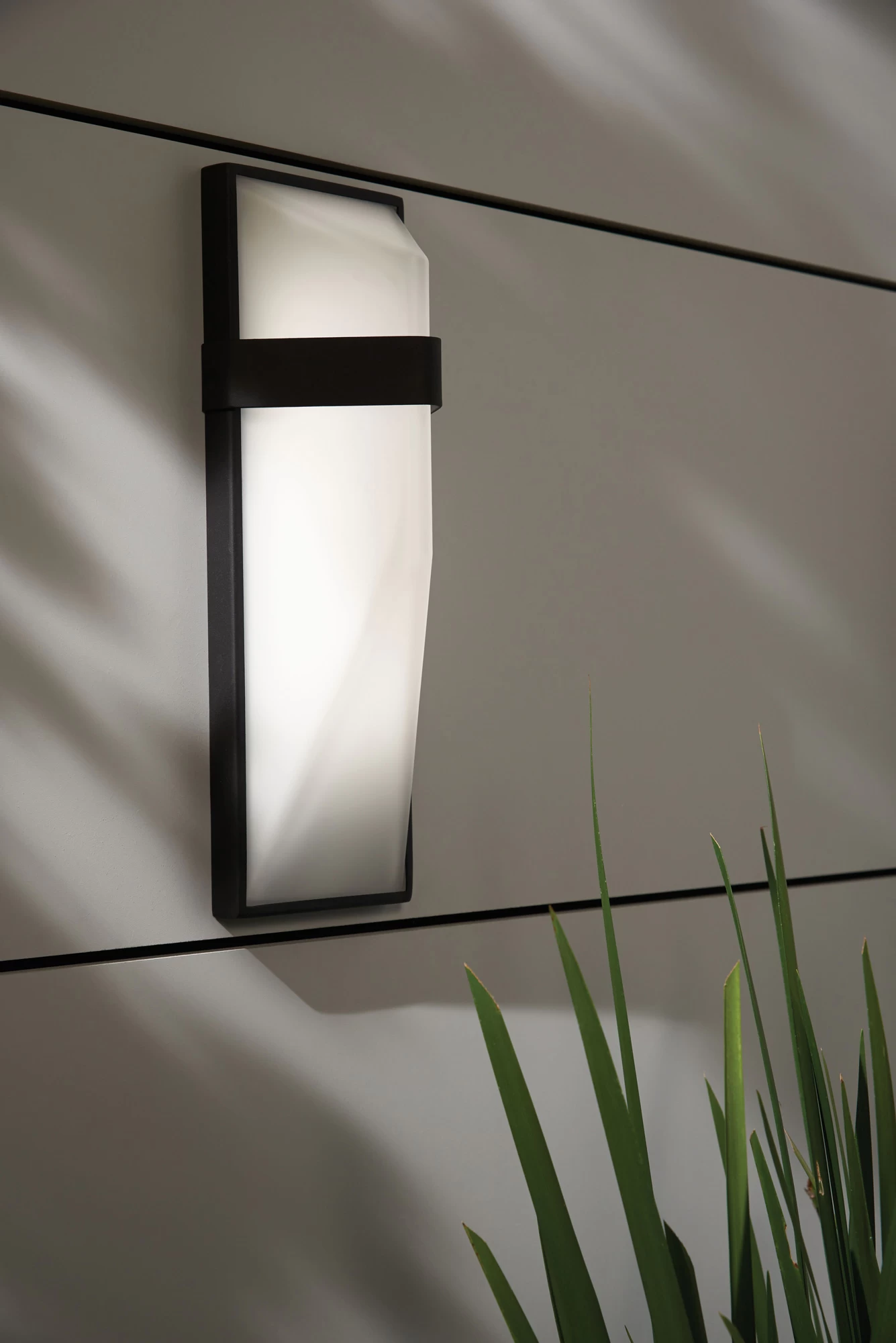 The Wedge Outdoor LED Wall Sconce features a Silver Dust or Black finish with an Etched White glass diffuser.