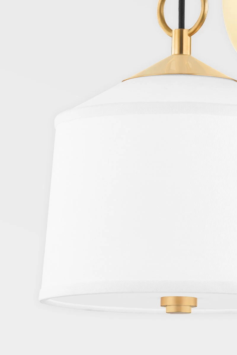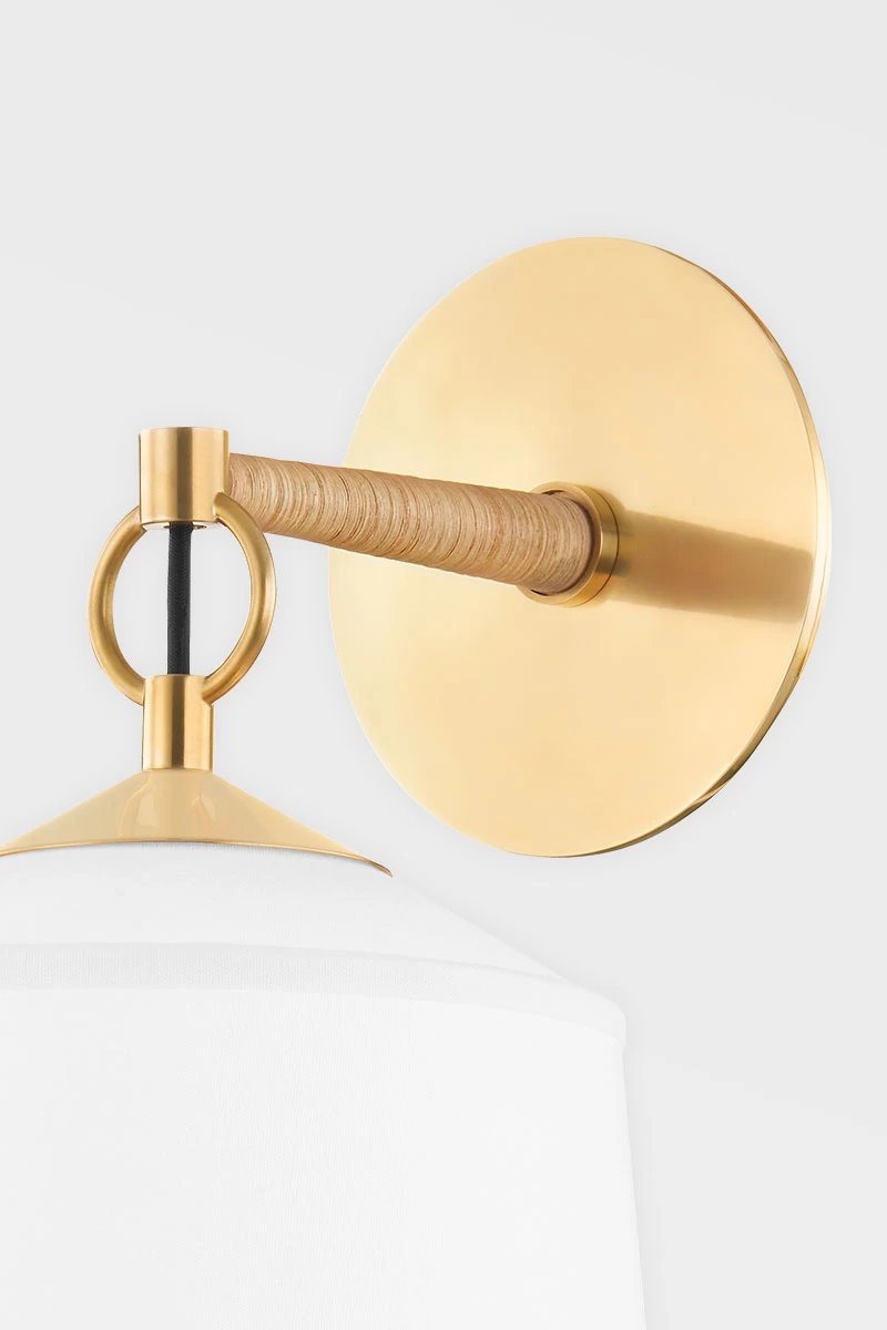The White Plains Wall Sconce features a classic shape with luxury details, and is the perfect piece for transitional interiors. The clean, crisp white linen shade blends beautifully with the sleek solid brass metalwork and natural wrapped rattan for a look that is warm yet modern.
