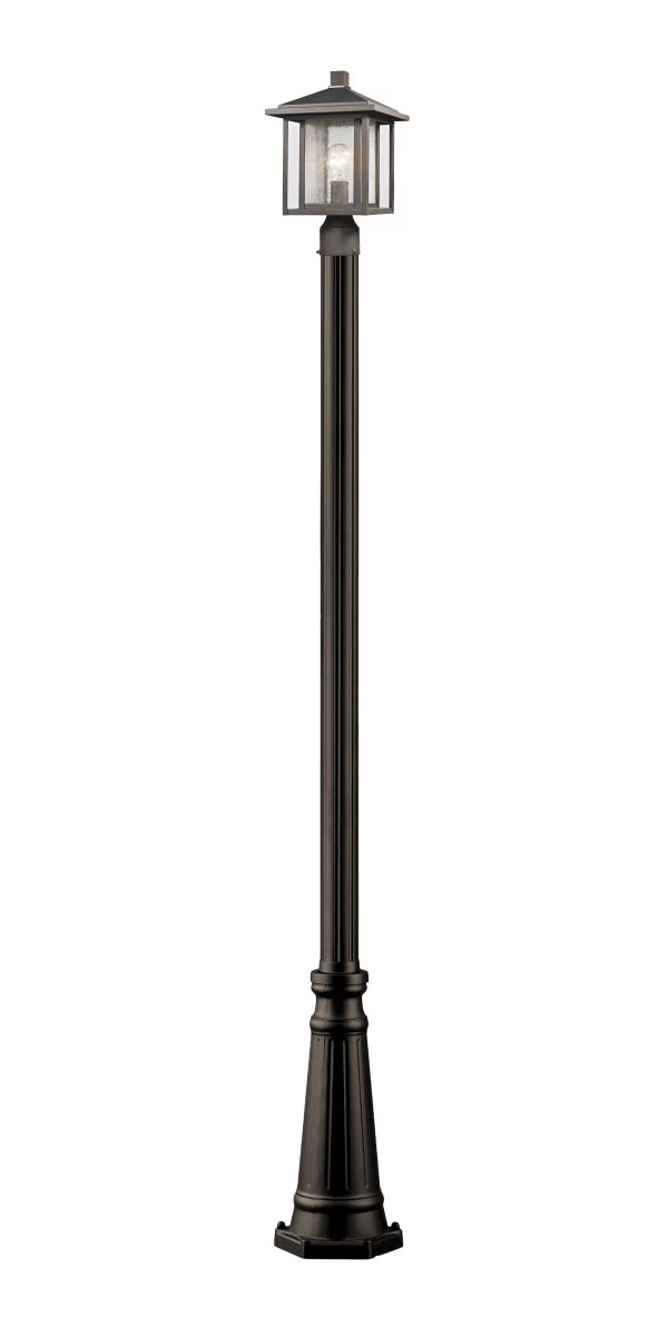 Aspen PHM Outdoor Pole Light features Clear Seeded glass with a Black or Oil Rubbed Bronze finish. One 100 watt, 120 volt A19 Medium base incandescent bulb is required, but not included. ETL listed for wet locations. 10 inch width x 108.5 inch height.