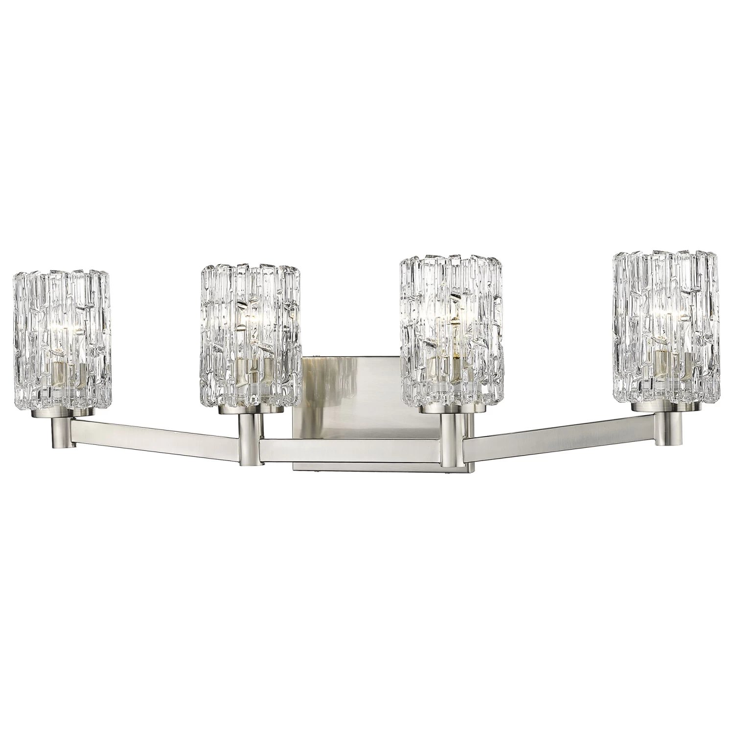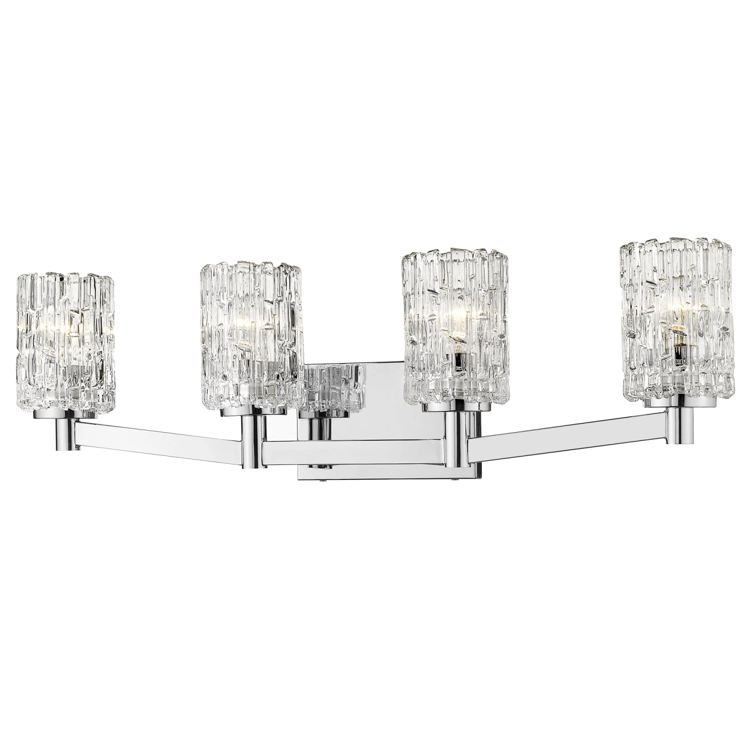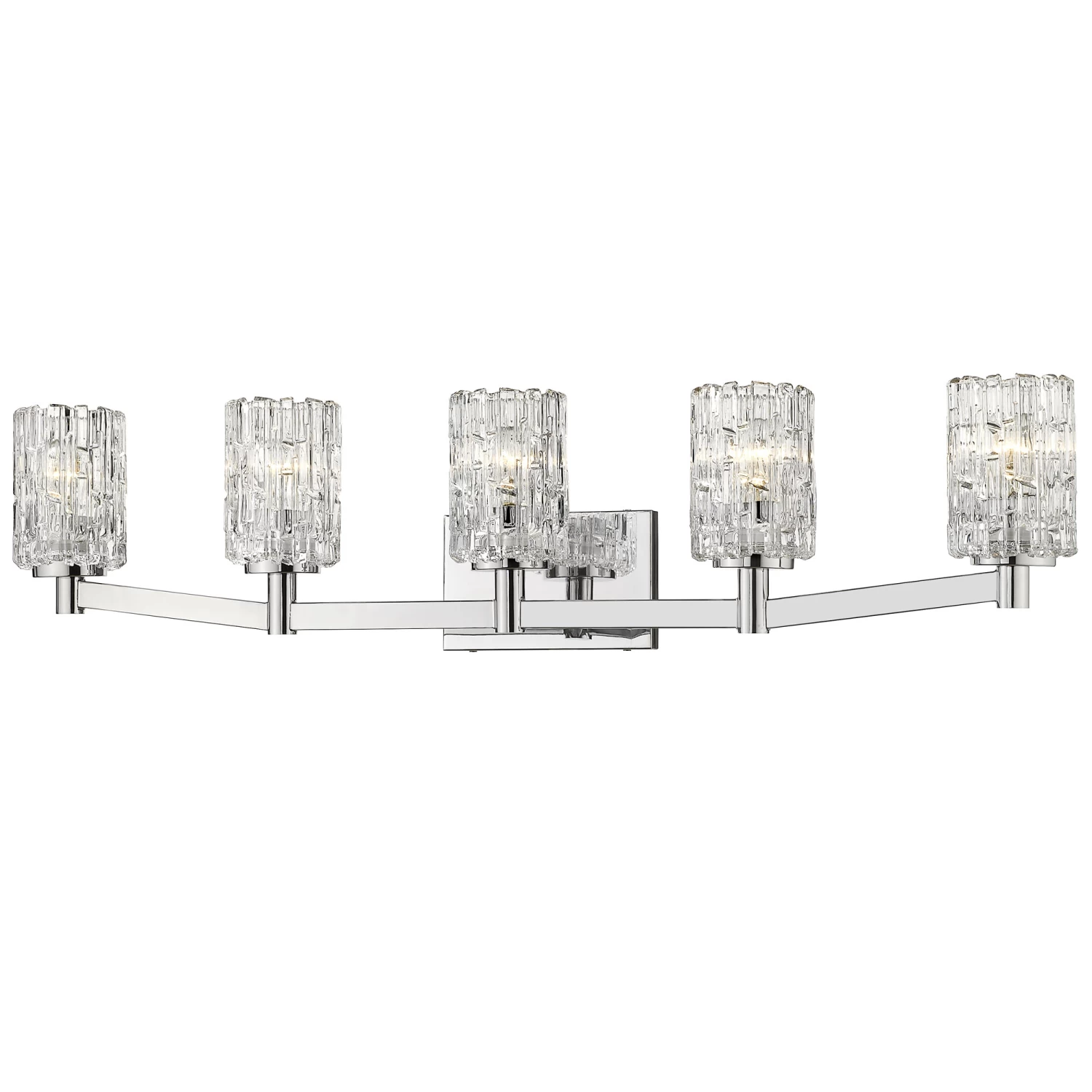 The Aubrey Bathroom Vanity Light offers an elegant look, featuring an array of cylindrical faceted Clear glass diffusers sheld out from a rectangular backplate finished in Brushed Nickel or Chrome. Available with 2, 3, 4, or 5 lights. ETL and cUL listed for damp locations.