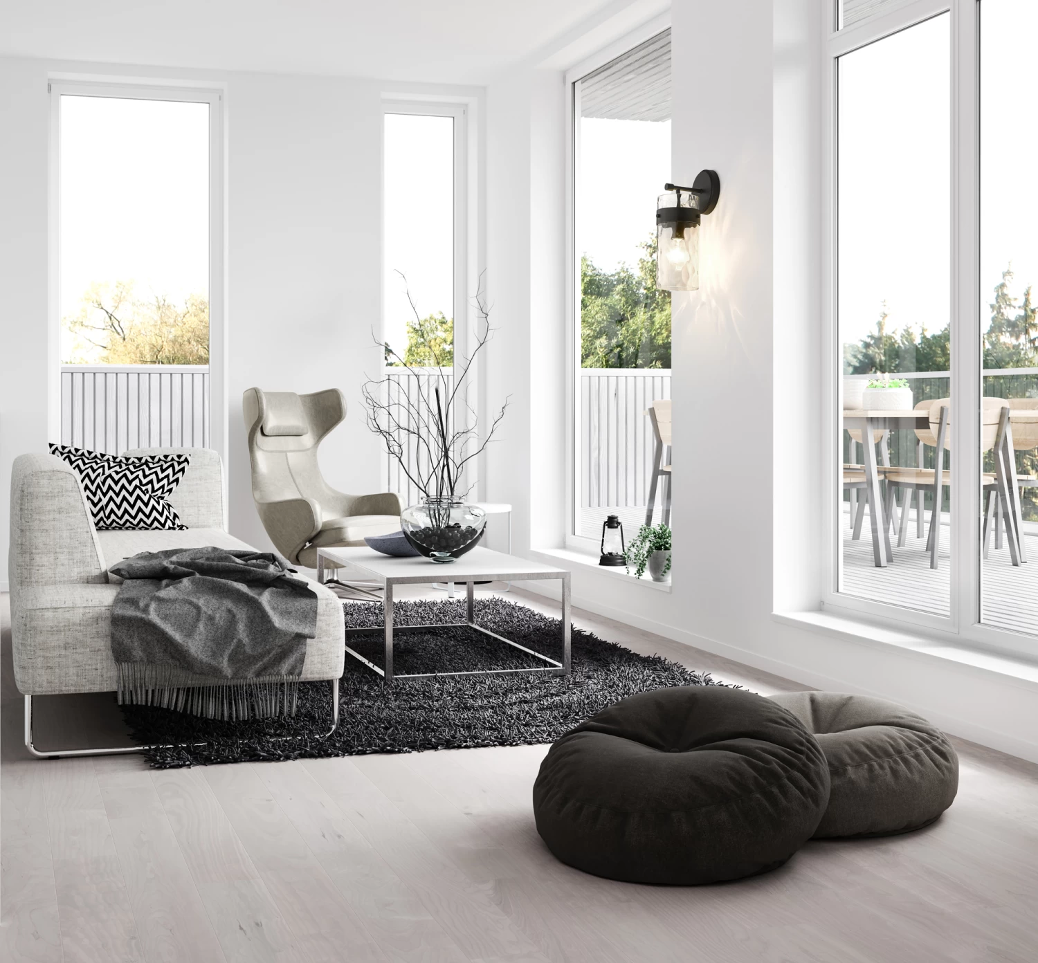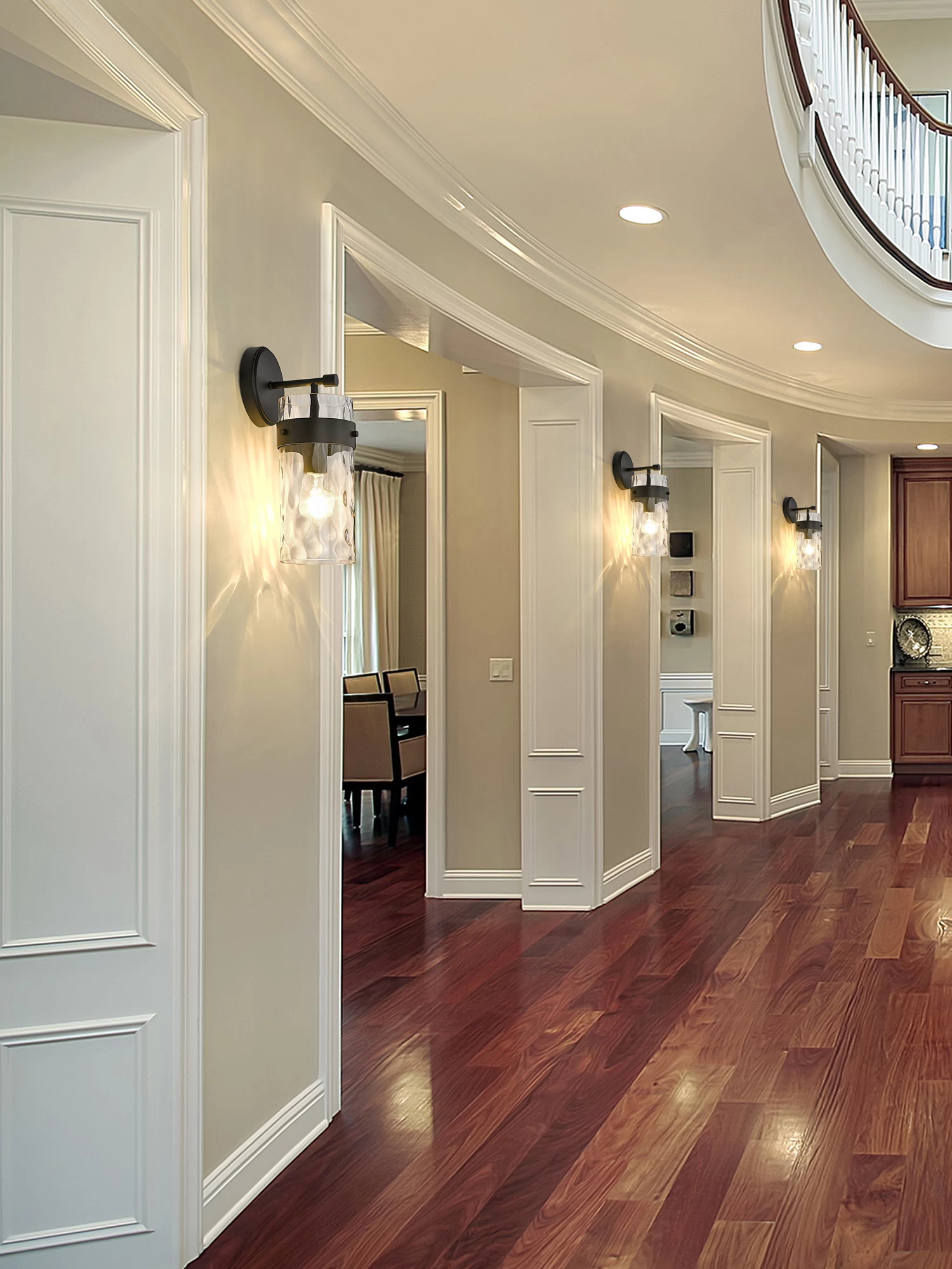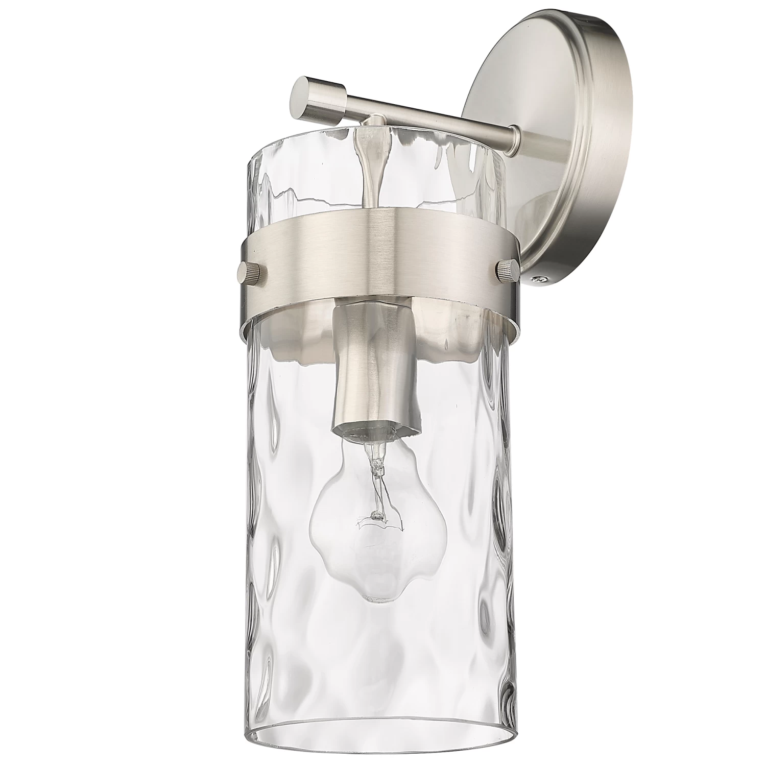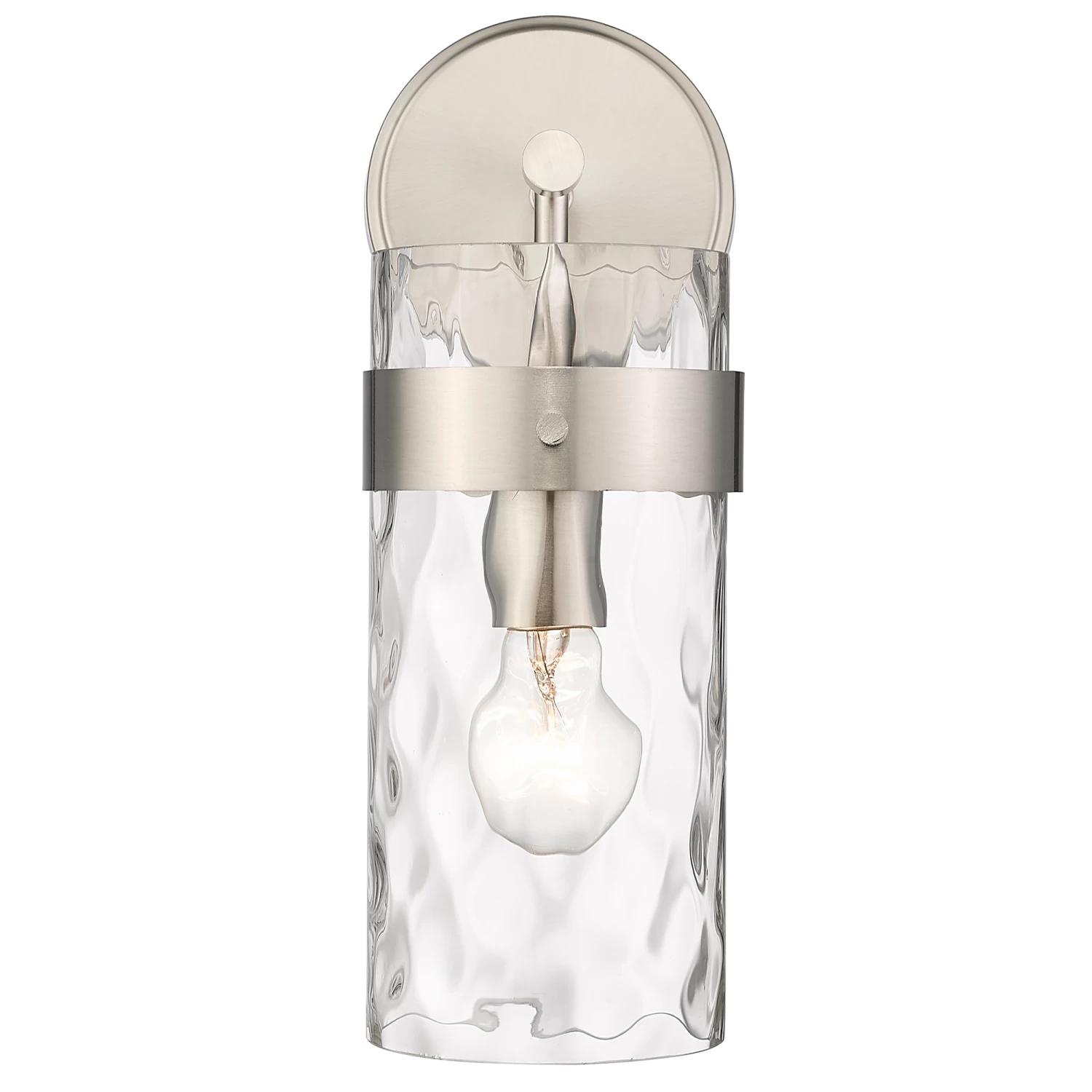 The Fontaine Wall Sconce adds a simple decorative glam to your interior space. The smooth steel frame is complemented with a cylindrical glass shade, that is rippled for a romantic effect, casting warm shadows across your room.